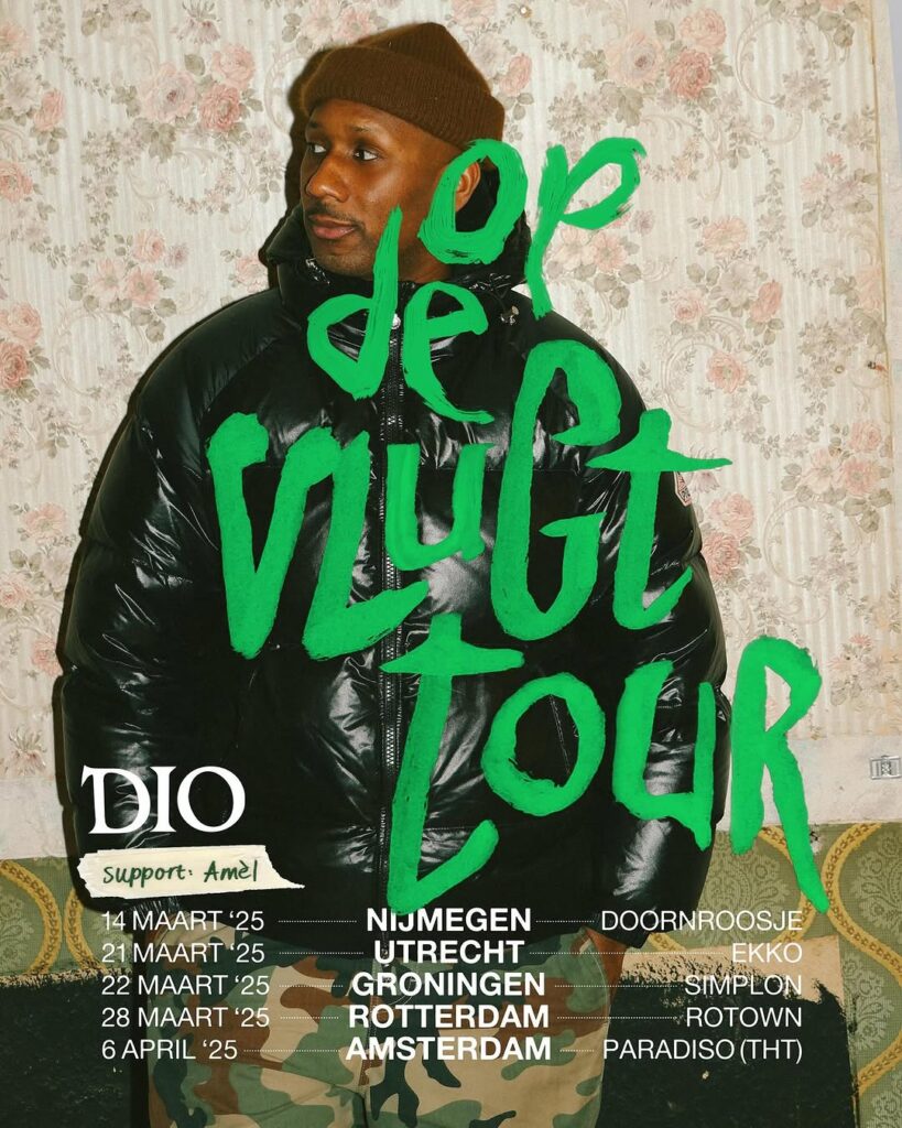 Maar Dio blijft niet alleen achter de schermen werken. In maart gaat hij op tournee met de onvergetelijke Amel voor zijn “Op De Vlugt Tour”. Samen zullen ze het publiek meenemen op een reis vol emoties, verhalen en natuurlijk, geweldige muziek. Amel, met zijn krachtige stem en unieke stijl, is de perfecte aanvulling op Dio’s boodschap en zal de show samen met hem versterken. Het wordt een tour die je niet wilt missen, want Dio en Amel gaan samen het licht zoeken in een wereld die soms te donker aanvoelt.
